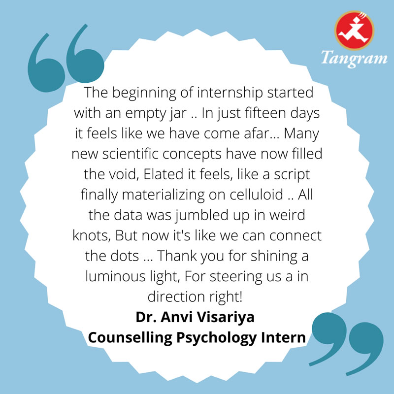 During the summer workshop this May at Samvedana for the underprivileged children residing in the slum areas of Vadaj, Tangram's two sessions, of taking the holistic test with 30 students and then discussing the profiles with them were extremely precious to us as well as our students. For them, such a comprehensive inquiry on their own self, for their career, was in itself a virgin treat! That gave them and their parents an altogether newer and clearer perception to view themselves as well as their own children. Even it gave us, at Samvedana, a clarity on the final picture on what we are working on, to support us fill up the puzzle pieces towards the making of a meaningful future for each student.